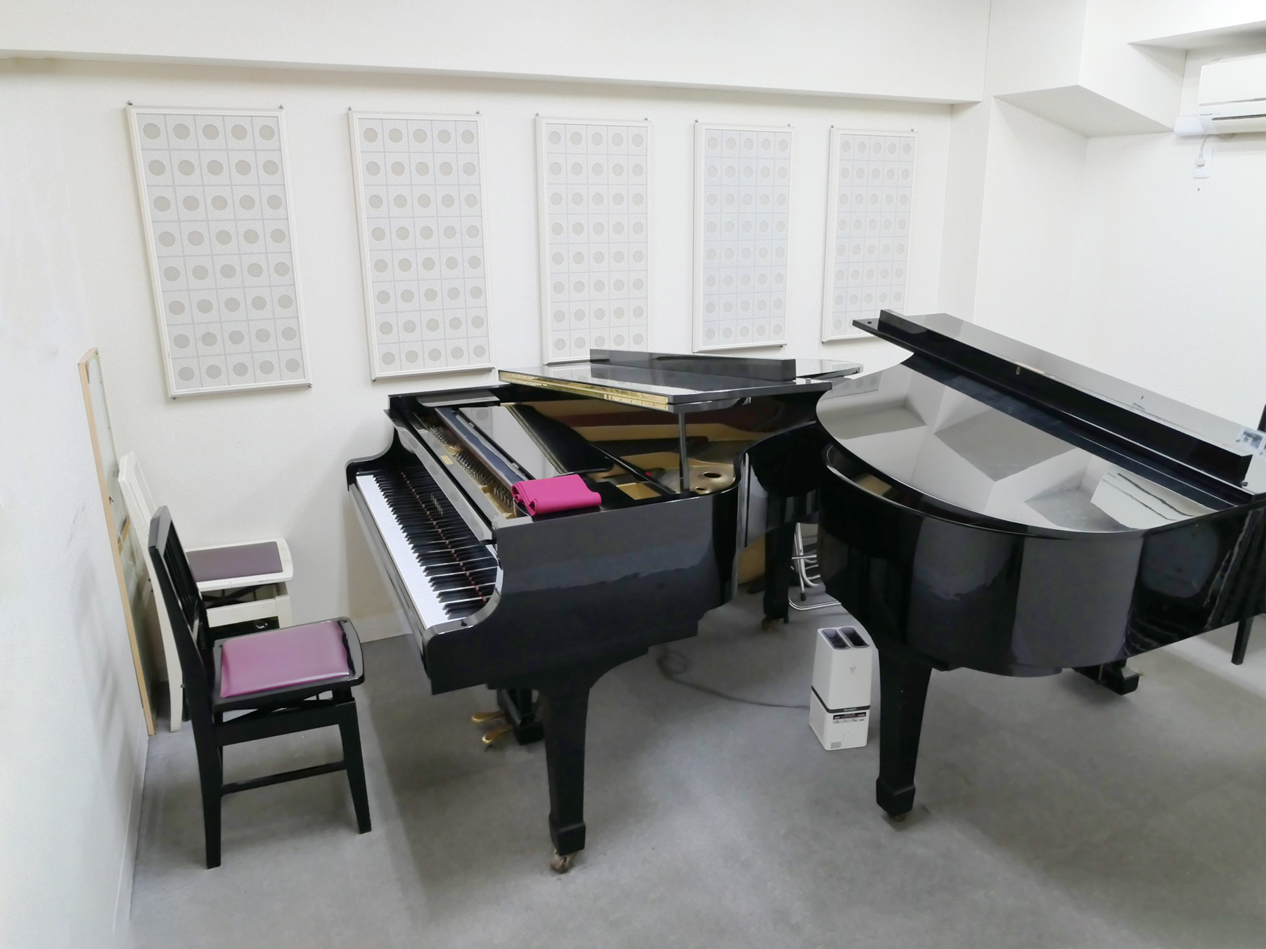 グランドピアノ2台が向かい合わに設備された2台ピアノ専用の練習サロン