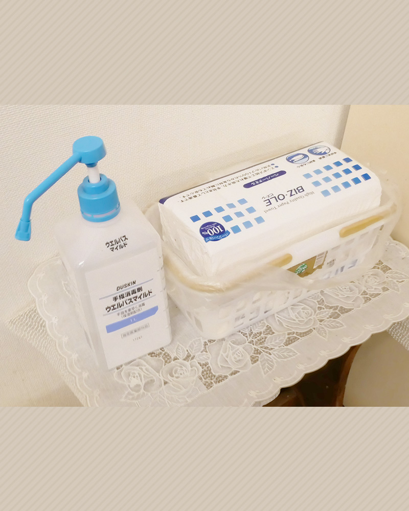 ウイルス対策用に手洗いの水道と消毒液を用意してあります。